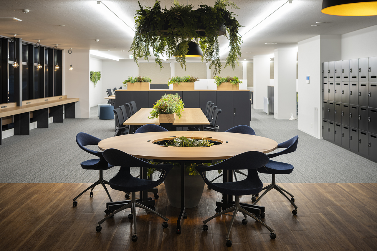 ナチュラルな木目調のオフィス家具を中心に植物と自然光を採り入れた明るいオフィスとなっています。どのエリアにいても自然を感じながら働くことが可能です。