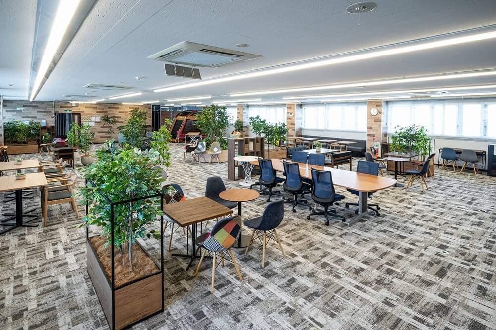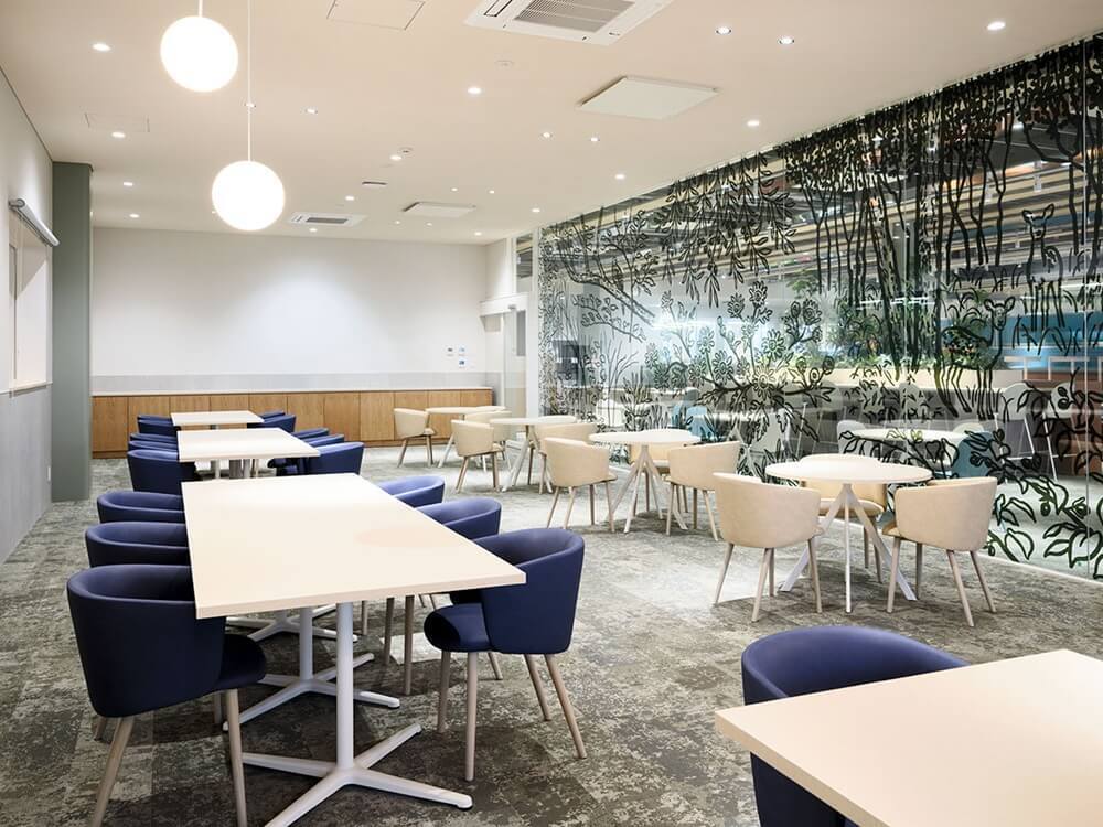 プロジェクトで重視したのは、リクルート強化と従業員の定着です。以前は長机をずらっと並べただけの殺風景だった食堂を、レイアウトの変更やフェイクグリーンの活用などによって、心やすらぐ空間に改善しました。さらに、食堂が空いている時間帯は見学会・説明会に活用し、若手採用や企業イメージの向上につなげています。