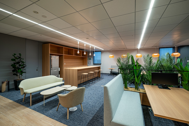 オフィスカフェとは、オフィス内に設置されたカフェスペースのことで、オフィスラウンジとも呼ばれます。従業員がリラックス効果やリフレッシュ効果を得られるよう、おしゃれなカフェのような空間を演出・設計しているのが特徴です。