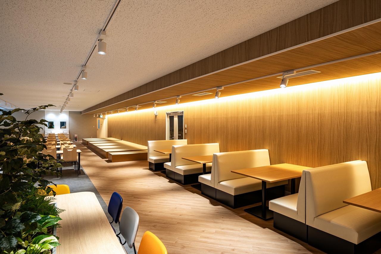 中でも目玉はアイリスチトセの家具と自社製品である合成皮革を使用したコラボレーション家具の導入。オフィスや食堂の家具に自社製品を使用することで、社員が実際に製品を見たり、触れたり、使用する機会をつくり自社品の品質の良さを感じてもらうことで、仕事や会社への誇りをもって働いてもらいたいというインナーブランディング要素を取り入れています。